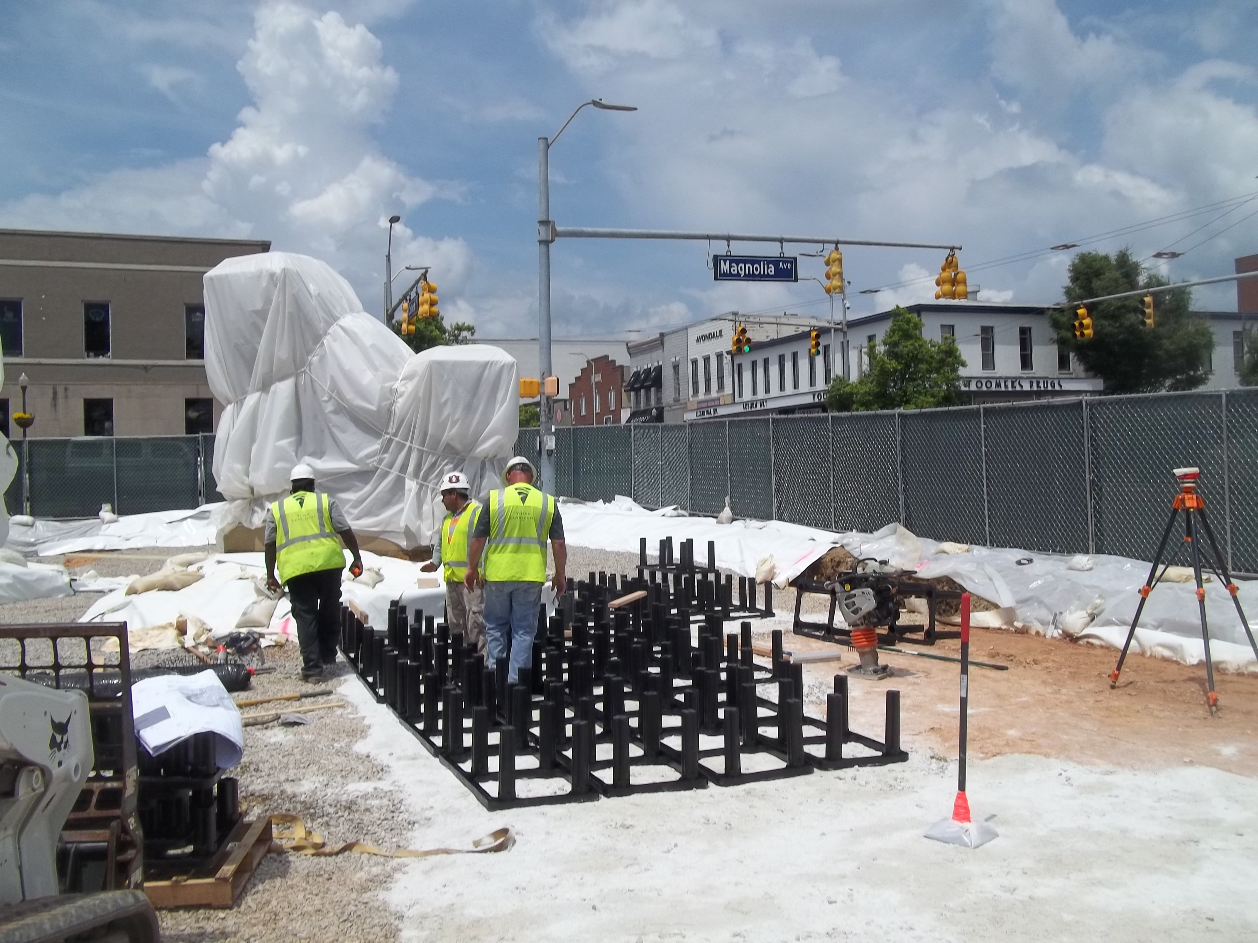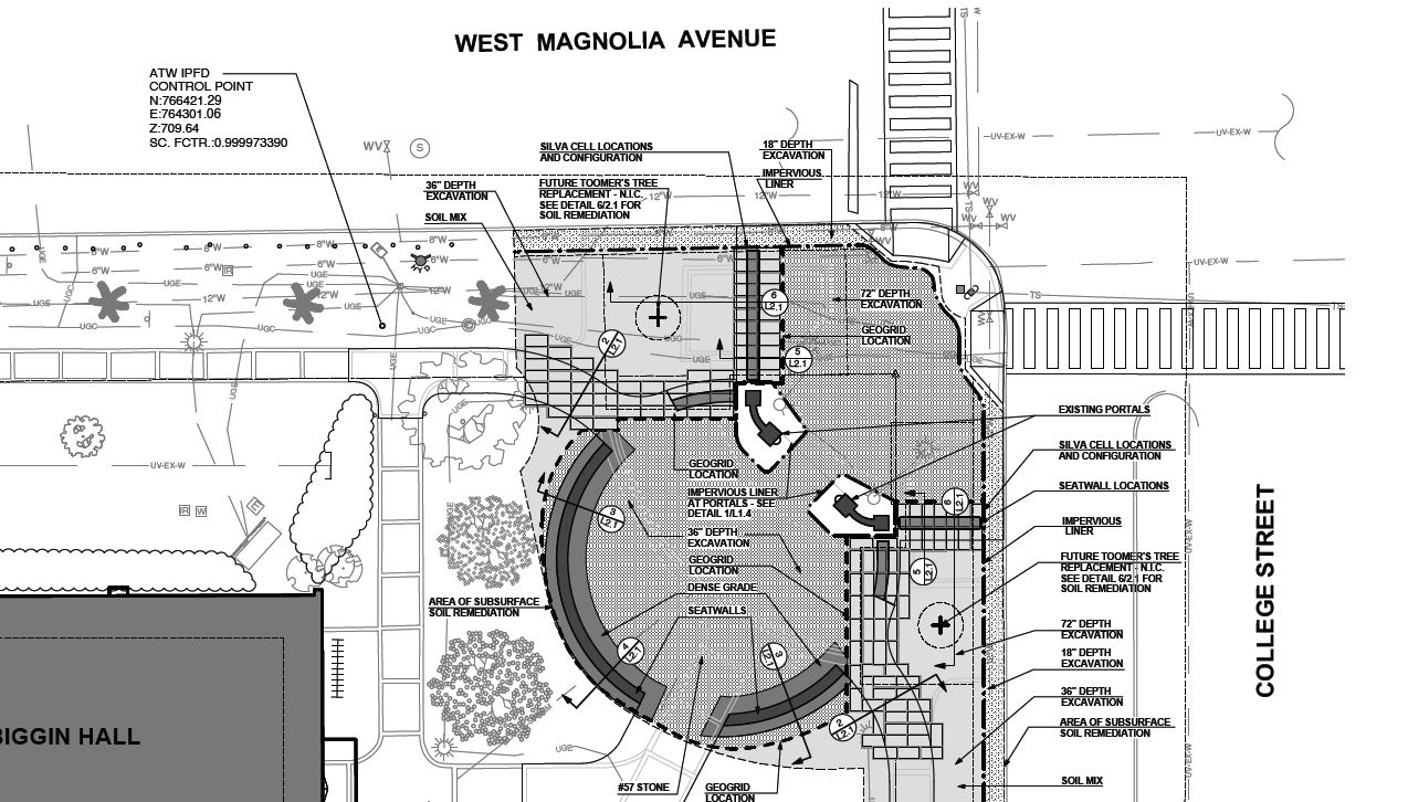 The contractor, Vision Landscapes, is currently working on getting the right soil mix. Once they do, the soil will go in and the site will be ready for planting. They intend for the new trees, which frame a corner entrance to the Auburn Campus on College Street and West Magnolia Avenue, to rise like sentries and re-establish an important gathering space for school spirit, celebration, and the commitment of the university to the symbols of its success.